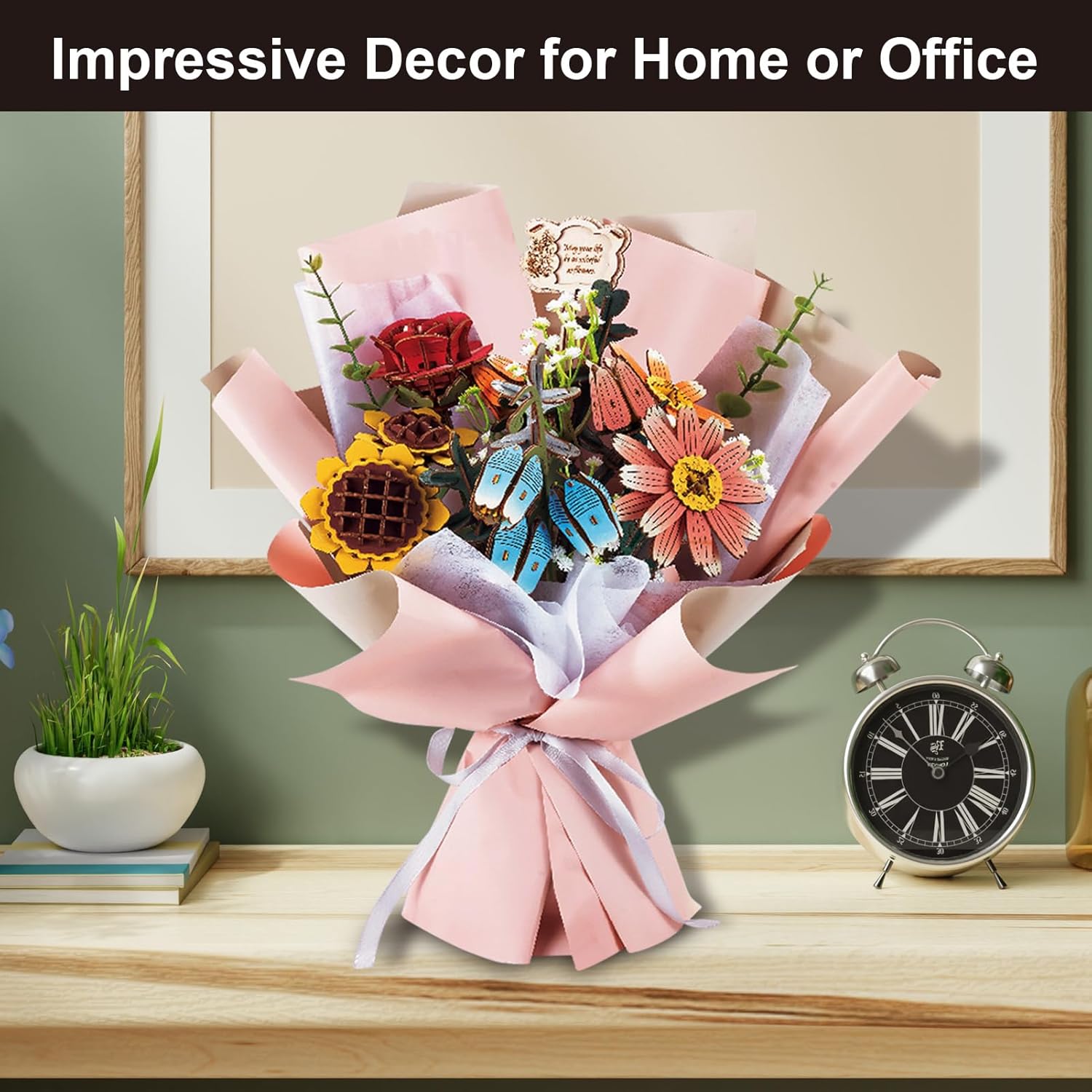 Surprise your loved ones with this delightful and unique bouquet that combines the beauty of nature with the charm of handcrafted wooden puzzles. Meticulously arranged, this one-of-a-kind gift features a vibrant red rose, cheerful sunflowers, and intricately designed wooden puzzles in the shapes of flowers and butterflies. Each piece is carefully crafted to delight and captivate, making this bouquet a truly memorable and thoughtful present. Wrapped in delicate pink tissue paper and tied with a satin ribbon, this arrangement is sure to bring joy and appreciation to any occasion. Celebrate life's special moments with this extraordinary floral and puzzle combination.