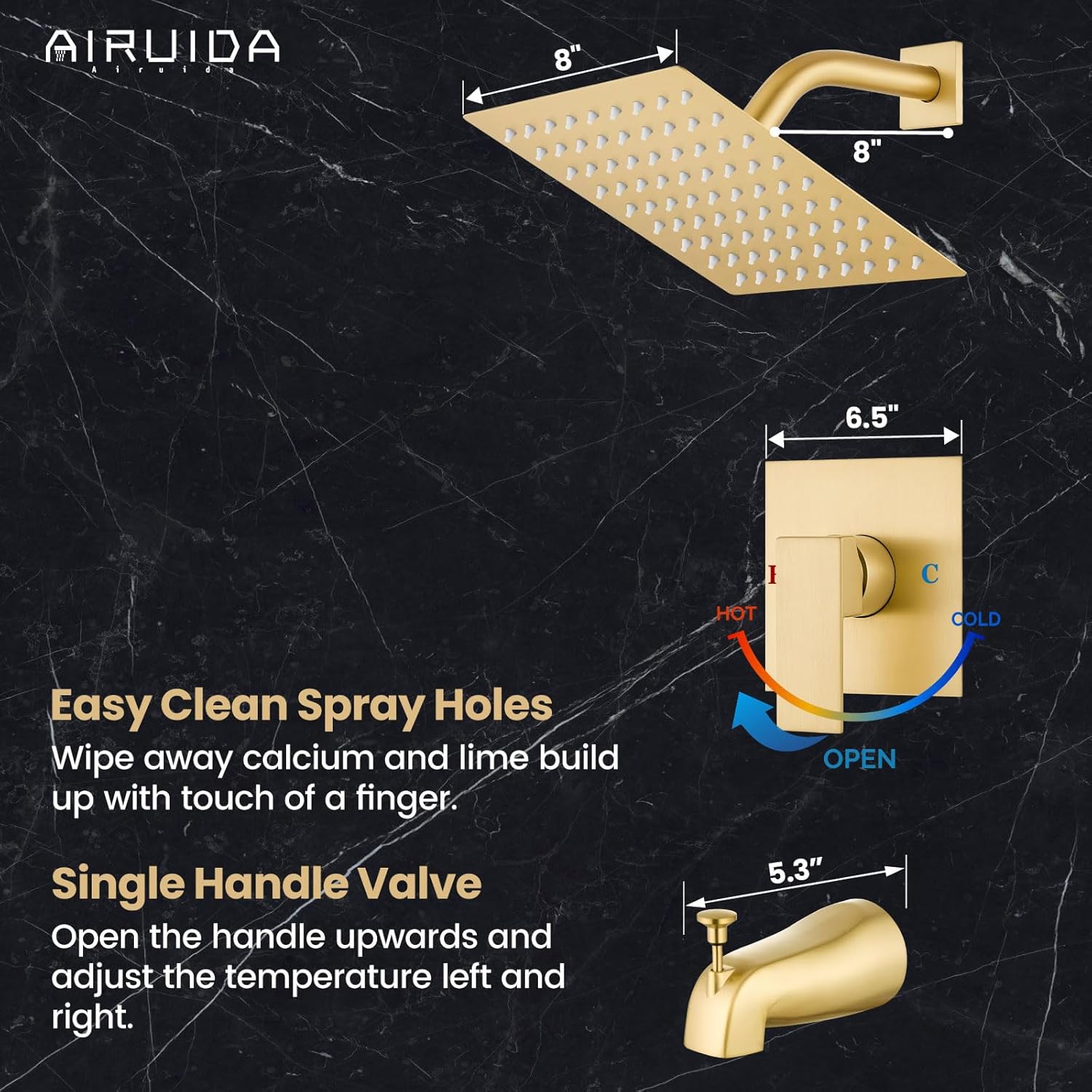 About Airuida: As a professional manufacturer of kitchen and bathroom products, Airuida is committed to providing the ultimate customer experience. With our focus on providing the most suitable kitchen and bathroom products, we have designed this faucet to cater to the usage habits of different customers.With its sleek design and high-quality materials, the Airuida kitchen faucet is guaranteed to meet all your needs. Upgrade your bathroom fixtures with the Airuida Bathtub & Shower Trim System. This shower head and handle set, shower faucet set with valve, and shower valve kit is made of high quality stainless steel 304 rainfall shower head and solid brass shower mixer valve construction, brushed gold finish and brass combination that offer anti-corrosion and anti-rust properties, ensuring its durability and dependability. The 1/2" NPT thread shower arm with wall mount 10 Inch square overhead shower design provides an air-in tech. The shower valve and trim kit with single handle design allows for effortless flow and temperature control. The single function simple shower faucet set features a single handle control for water flow and temperature, promoting a seamless, premium showering experience. The wall mount rainfall shower head and shower kit with valve installation type makes installation a breeze, with clear instructions included. The Airuida Bathtub & Shower Trim System promises a lifetime warranty and provides any replacement necessary for future use, making it a sound investment in the longevity of your bathroom fixtures.